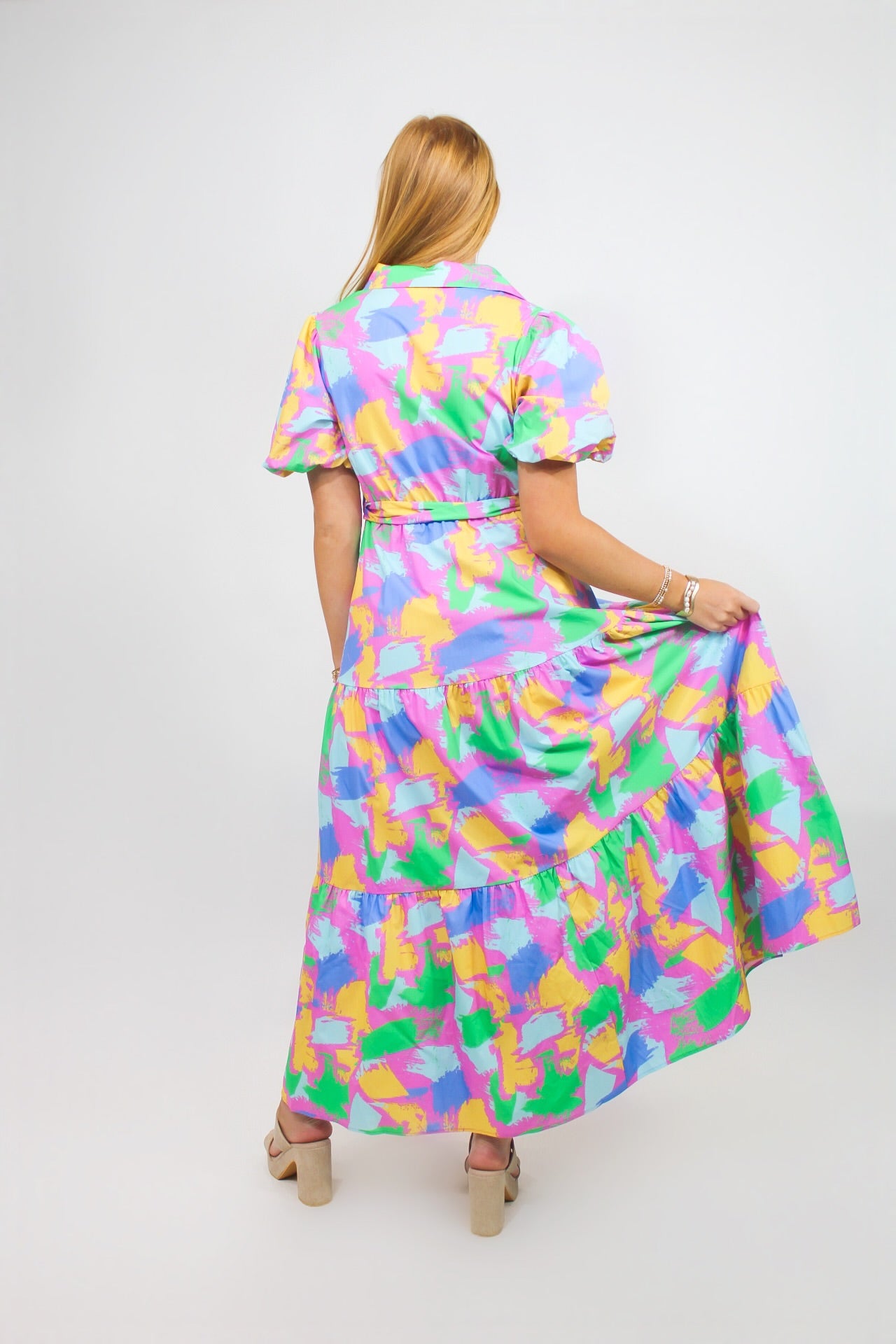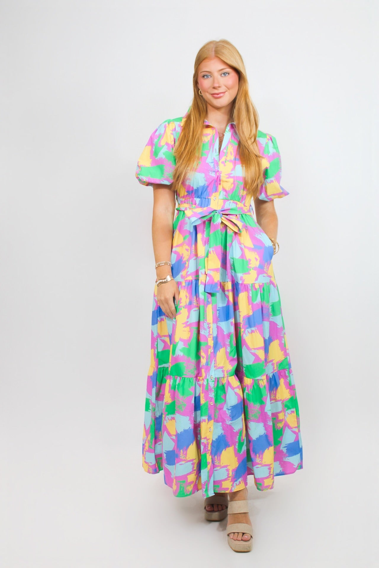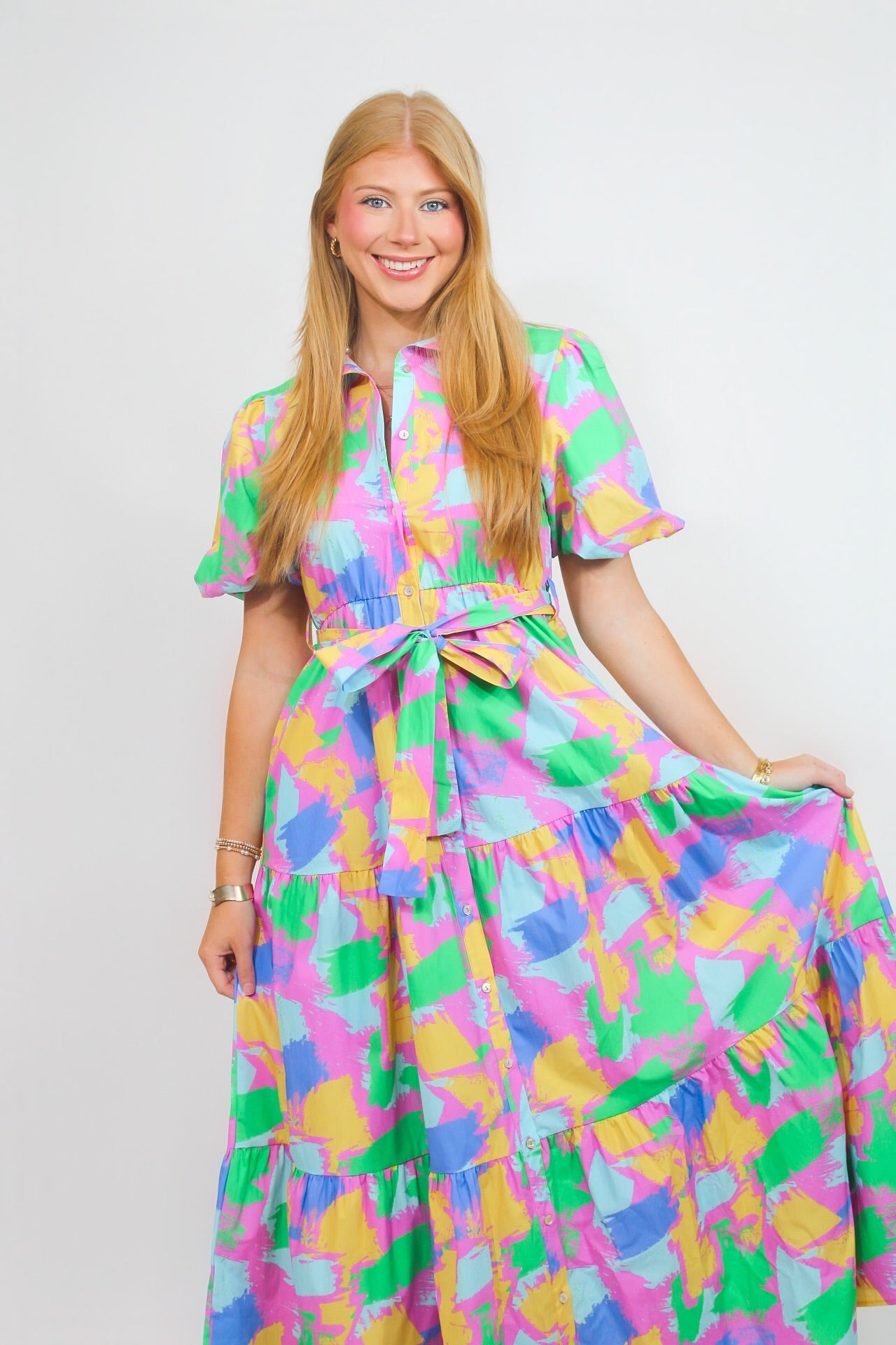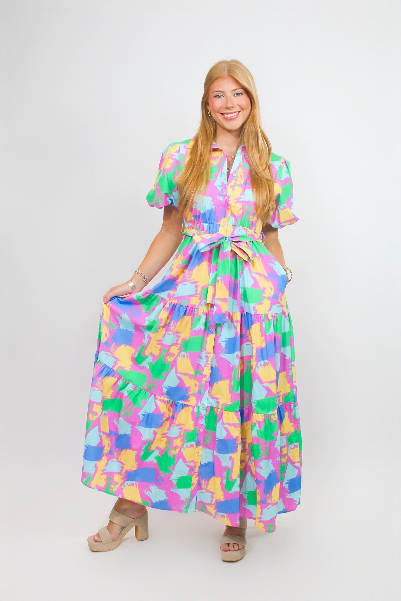 Courtney is 5’6 wearing a size small.- Button Down Maxi.- Color Splotch Pattern.- True to Size.