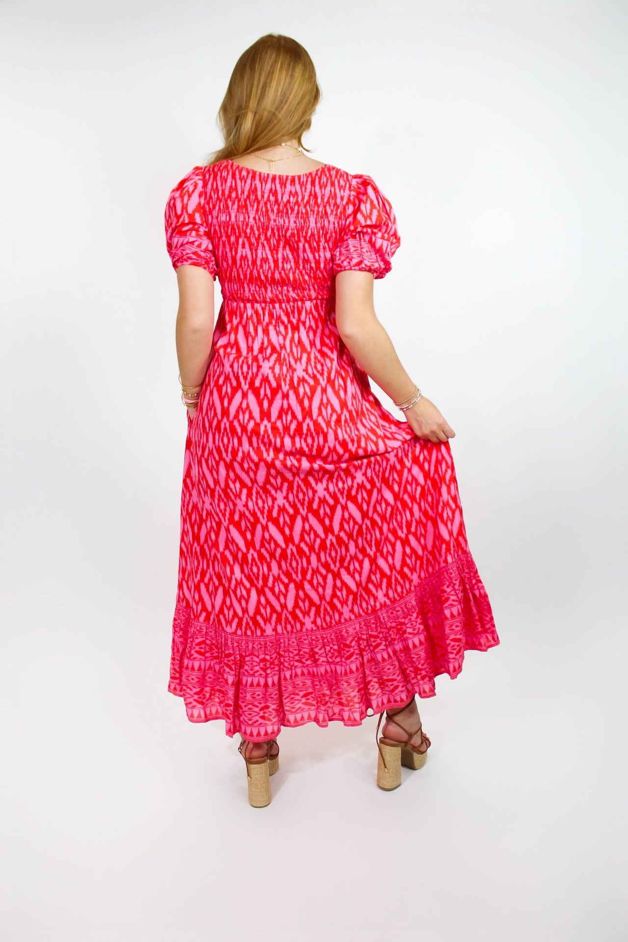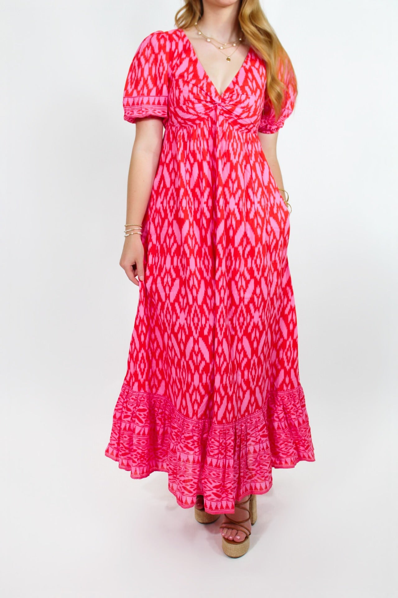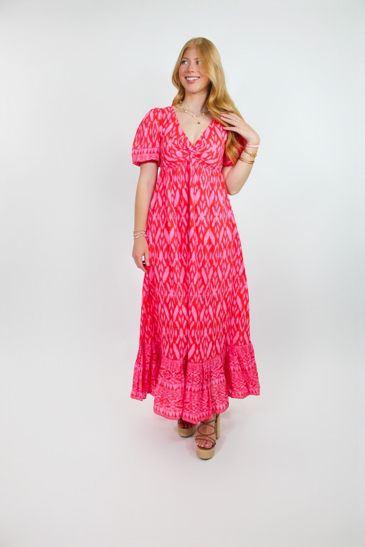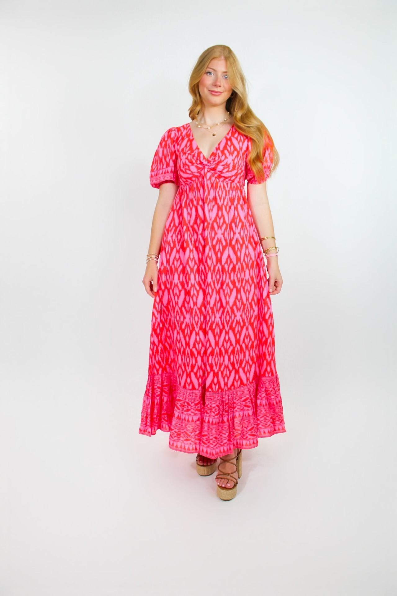 Cleobella BrandCourtney is 5’6 wearing a size xsmall.- V-Neck.- Pink & Orange Detailing.- True to Size.