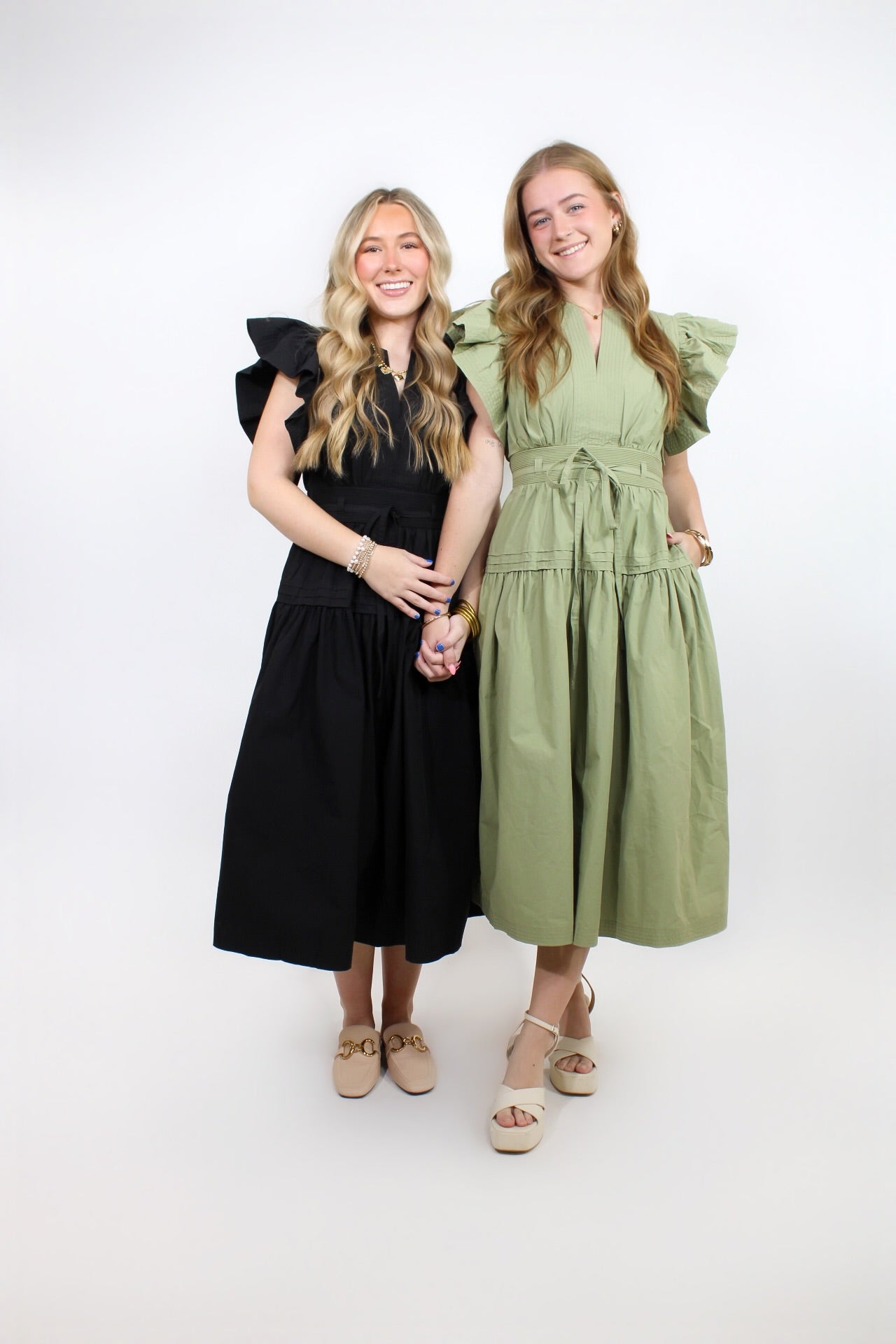 Rachel is 5’3 wearing a size small. Morgan is 5’4 wearing a size small.