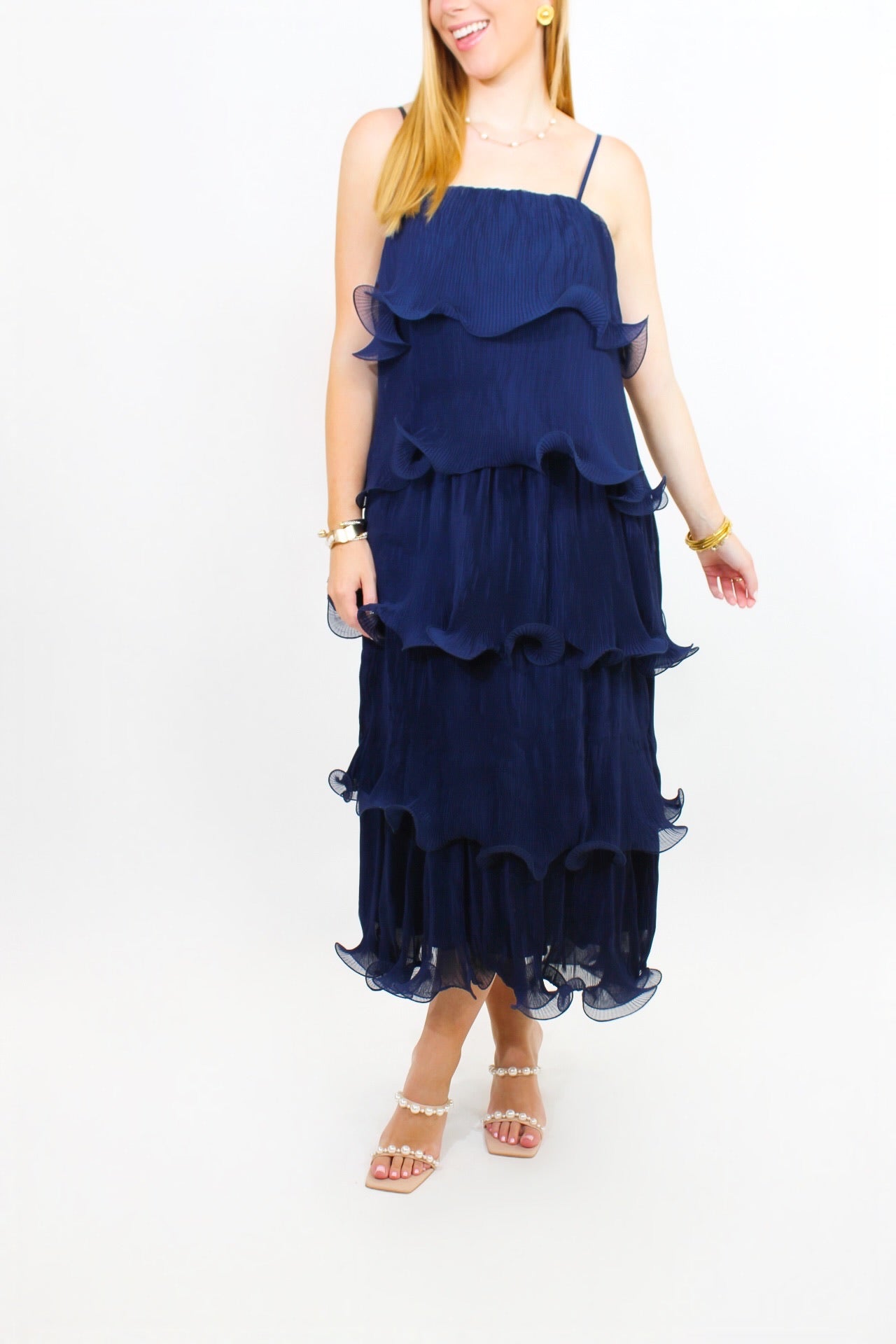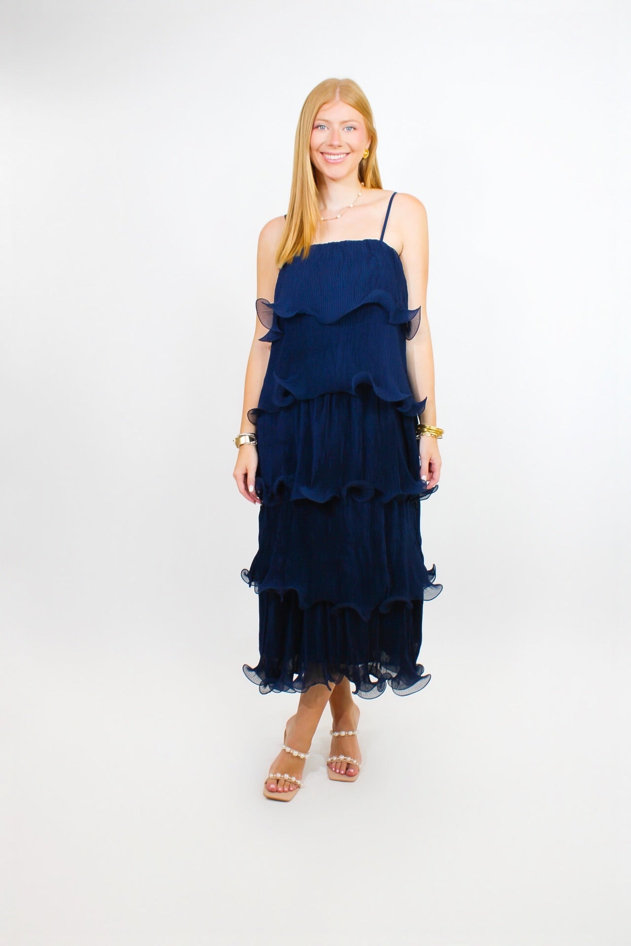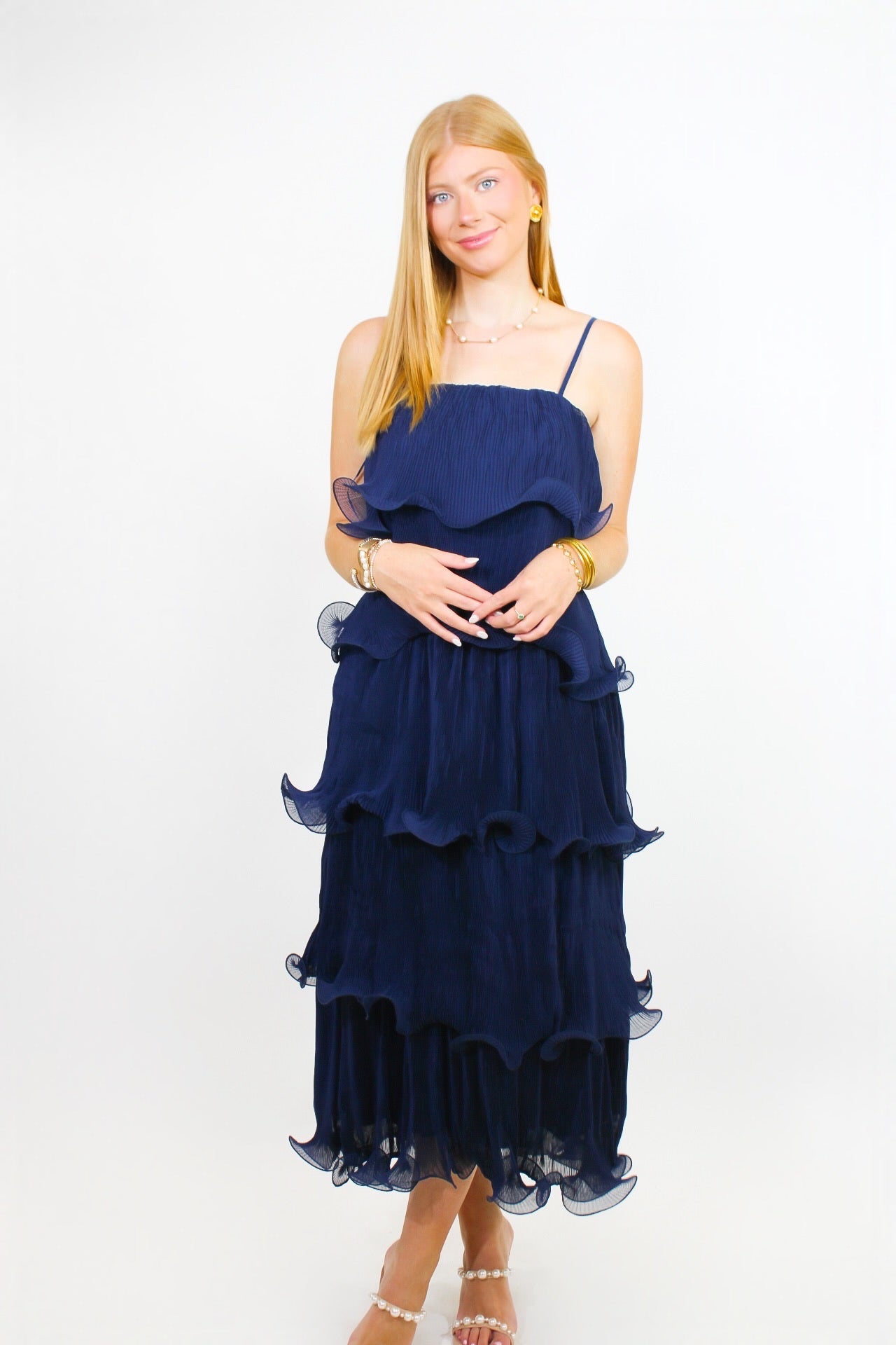 Courtney is 5’6 wearing a size small.- Adjustable Straps.- Tiered Maxi Dress.- True to Size.